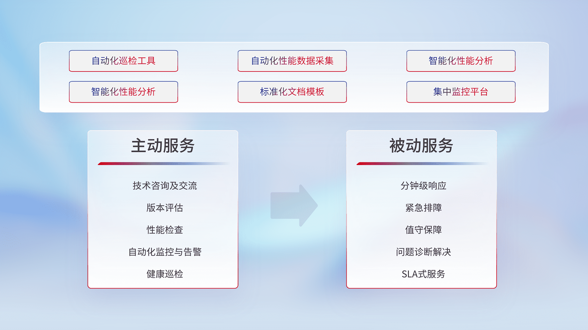 智能化工具和标准化文档,,,保障服务质量,,,提供主动服务(包含技术咨询、、版本评估、、、性能检查、、自动化监控与告警、、、健康巡检)和被动服务包含(分钟级响应、、、紧急排障、、、、值守保障、、问题诊断解决、、、SLA服务)。。。