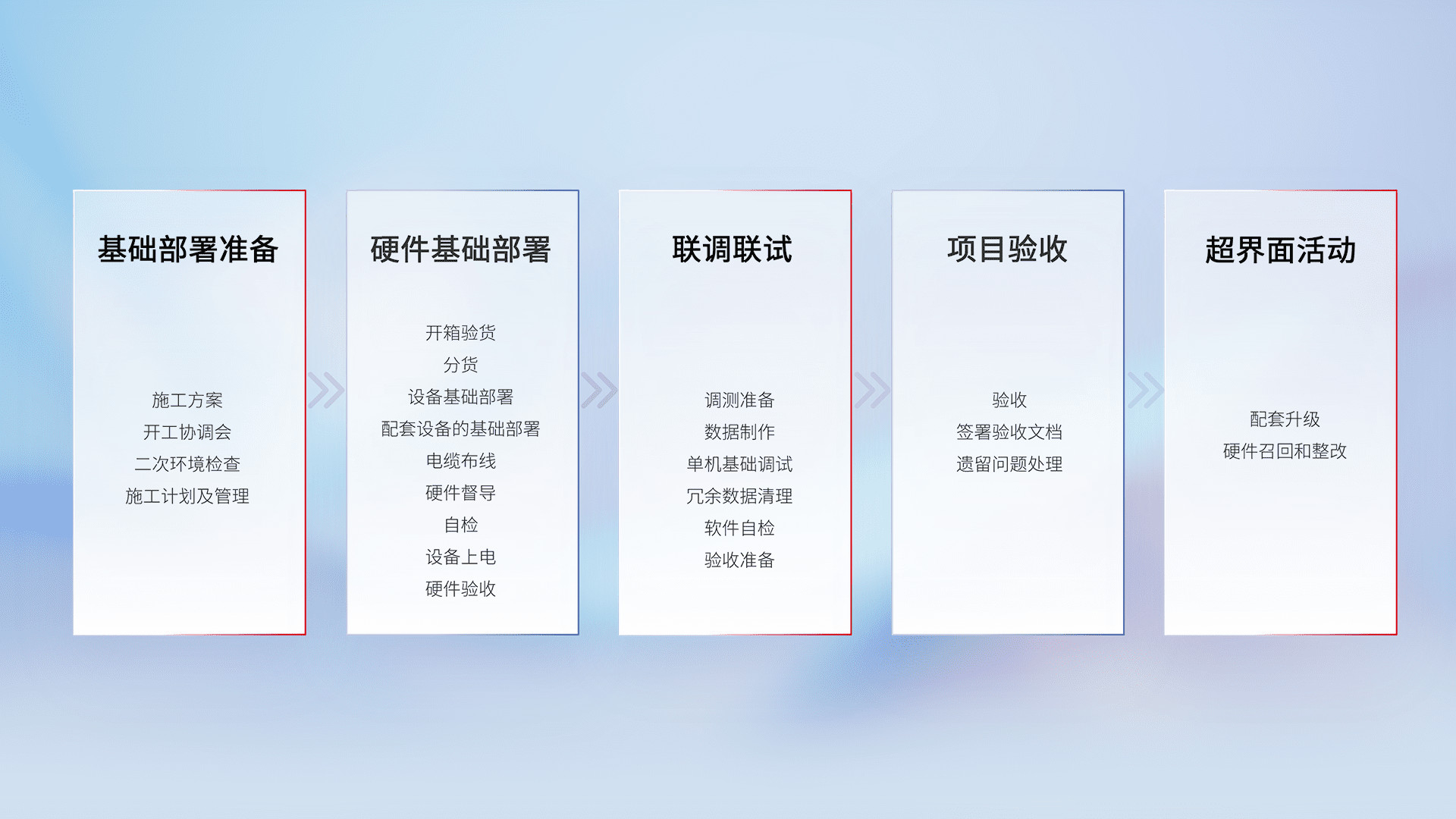 从基础部署准备、、、硬件基础部署、、联调联试、、、、项目验收、、、越界面活动的全过程可追溯,,,,保证施工质量和进度。。